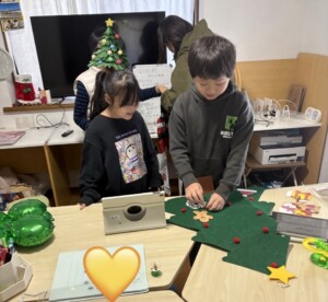 クリスマス会では、プレゼント交換やビンゴ大会、カードゲームをして楽しみました。クッキングでは、ステンドグラスクッキー作りに挑戦しました。一人ひとり時間をかけて丁寧に作ったクッキーは、各家族へのお土産にもなりました。